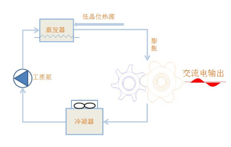 基于有機(jī)郎肯循環(huán)(Organic Rankine Cycle簡稱ORC)原理,利用低品位熱源產(chǎn)生動力:通過低沸點有機(jī)工質(zhì)獲取其他介質(zhì)的熱能,轉(zhuǎn)化為壓力能,通過膨脹機(jī)將壓力能轉(zhuǎn)化為機(jī)械能,最終通過發(fā)電機(jī)將機(jī)械能轉(zhuǎn)化為電能。